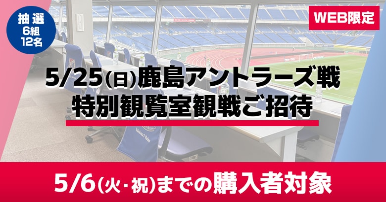5/6(火祝)までにご入会の方から抽選で6名様に、 5/25(日)鹿島アントラーズ戦の特別観覧室にペアでご招待いたします。